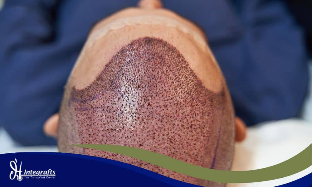 Kulit kepala mungkin terlihat merah muda (pinkish). Di area donor (belakang), rambut mungkin terlihat tipis karena belum tumbuh sempurna menutupi bekas pengambilan.